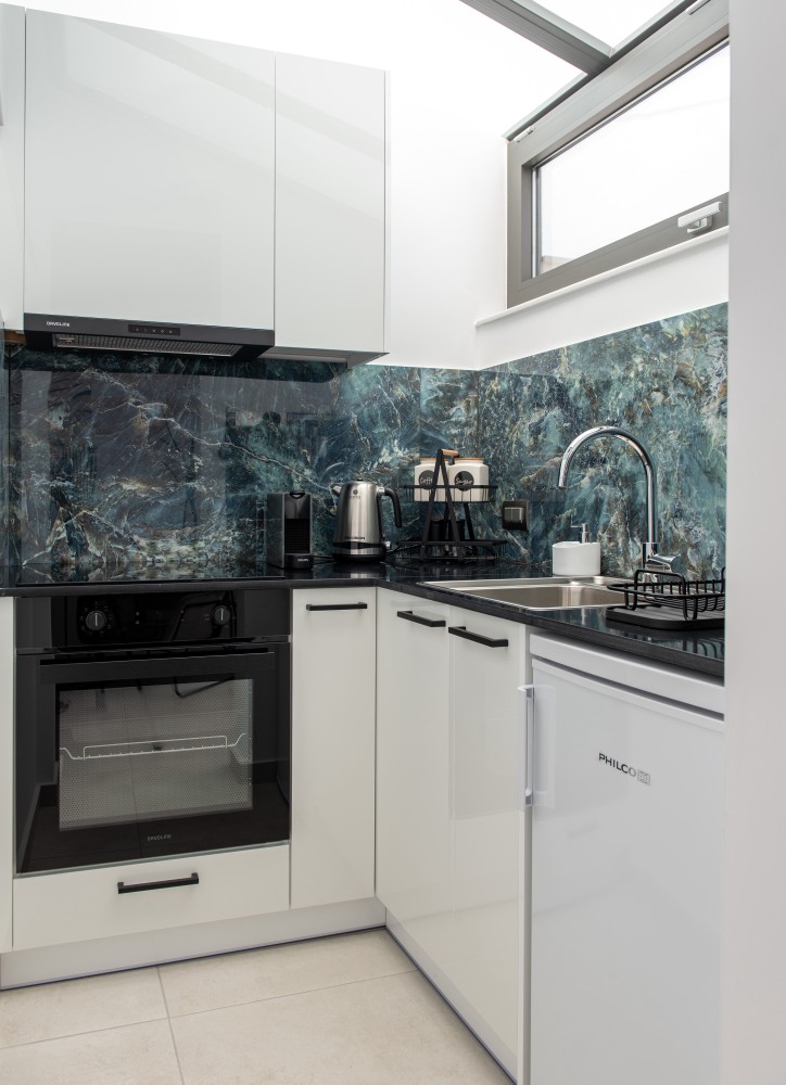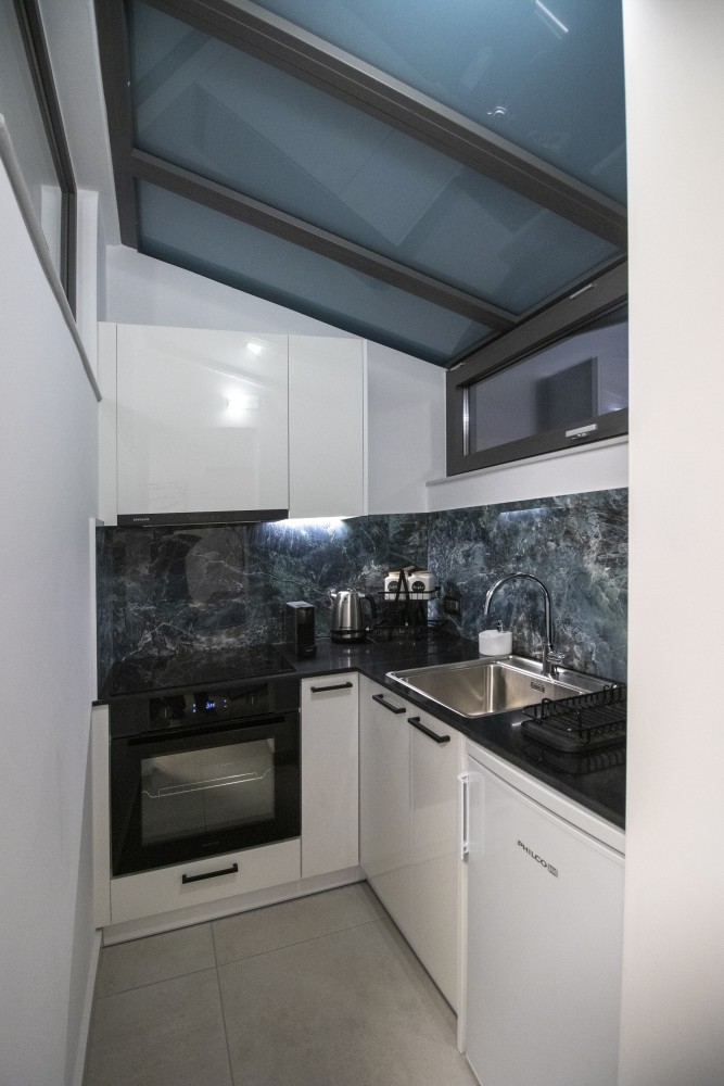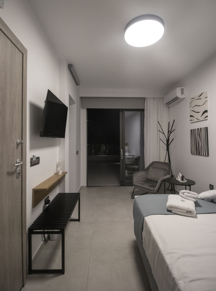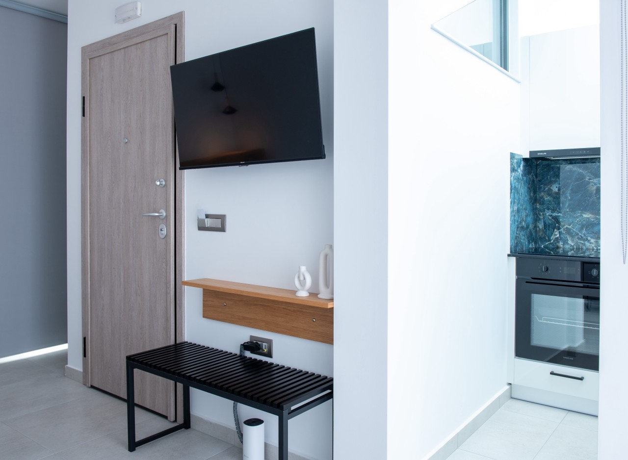 Although smaller in size, this 3rd-floor studio apartment boasts the advantage of a larger balcony, providing an excellent space for relaxation. The room receives plenty of natural light and includes a superior quality double bed. Guests can enjoy high-speed complimentary Wi-Fi and a wide selection of local and satellite channels on the 40-inch smart TV. The open-plan kitchen is fully operational, with all necessary appliances and utensils for preparing meals. The modern bathroom features spacious shower facilities and complementary towels for guests' convenience.