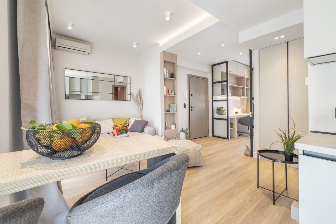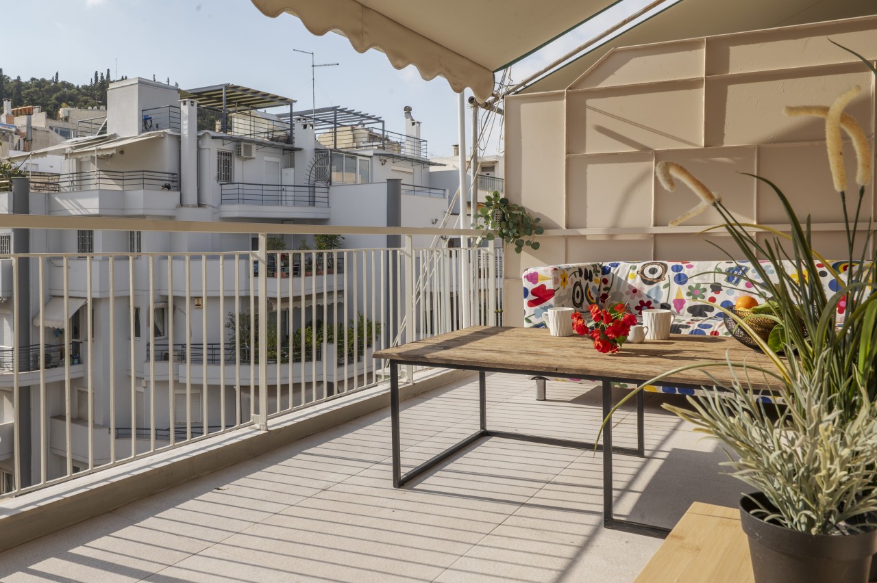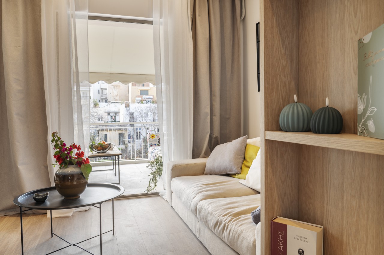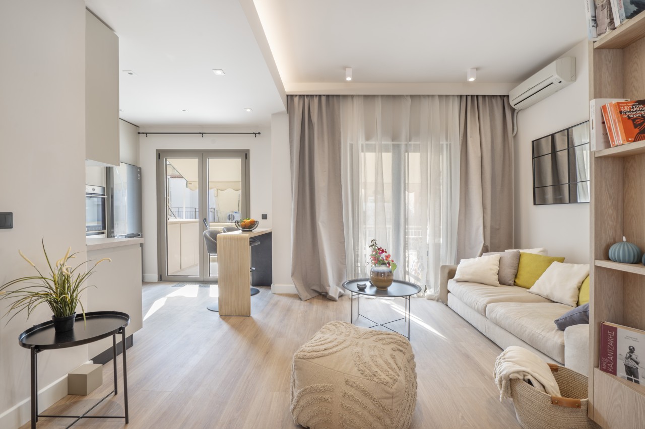 The main living area features a sleek, low-profile sofa in muted tones, a small dining space for 2 and an open plan kitchen.The kitchen is compact but fully equipped (dishwasher, stove, nespresso coffee machine) , featuring modern stainless steel appliances .The living area opens up into a spacious veranda overlooking Lykavitos hill