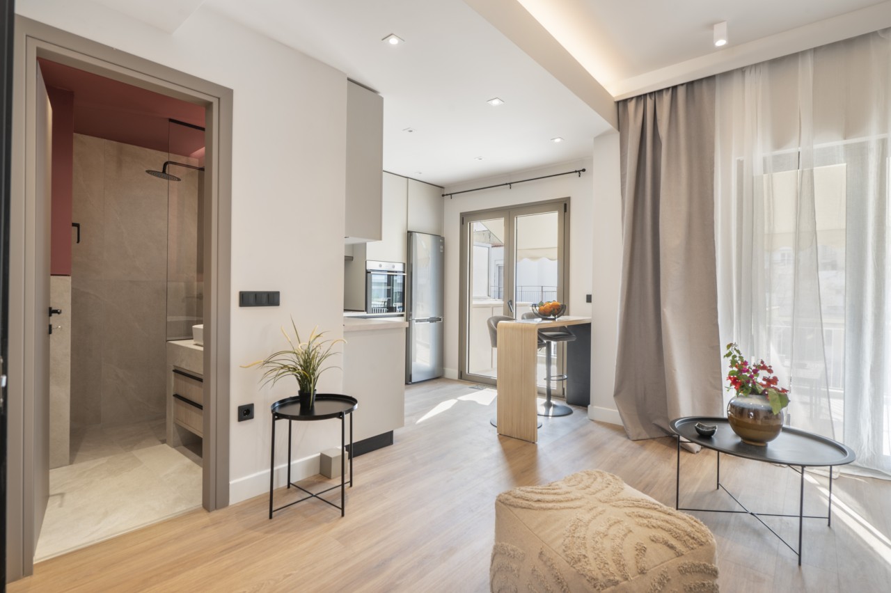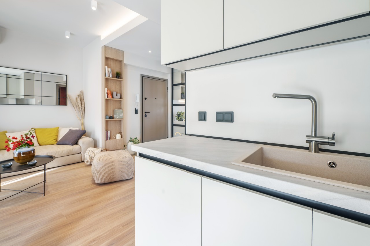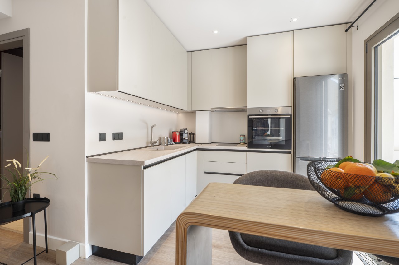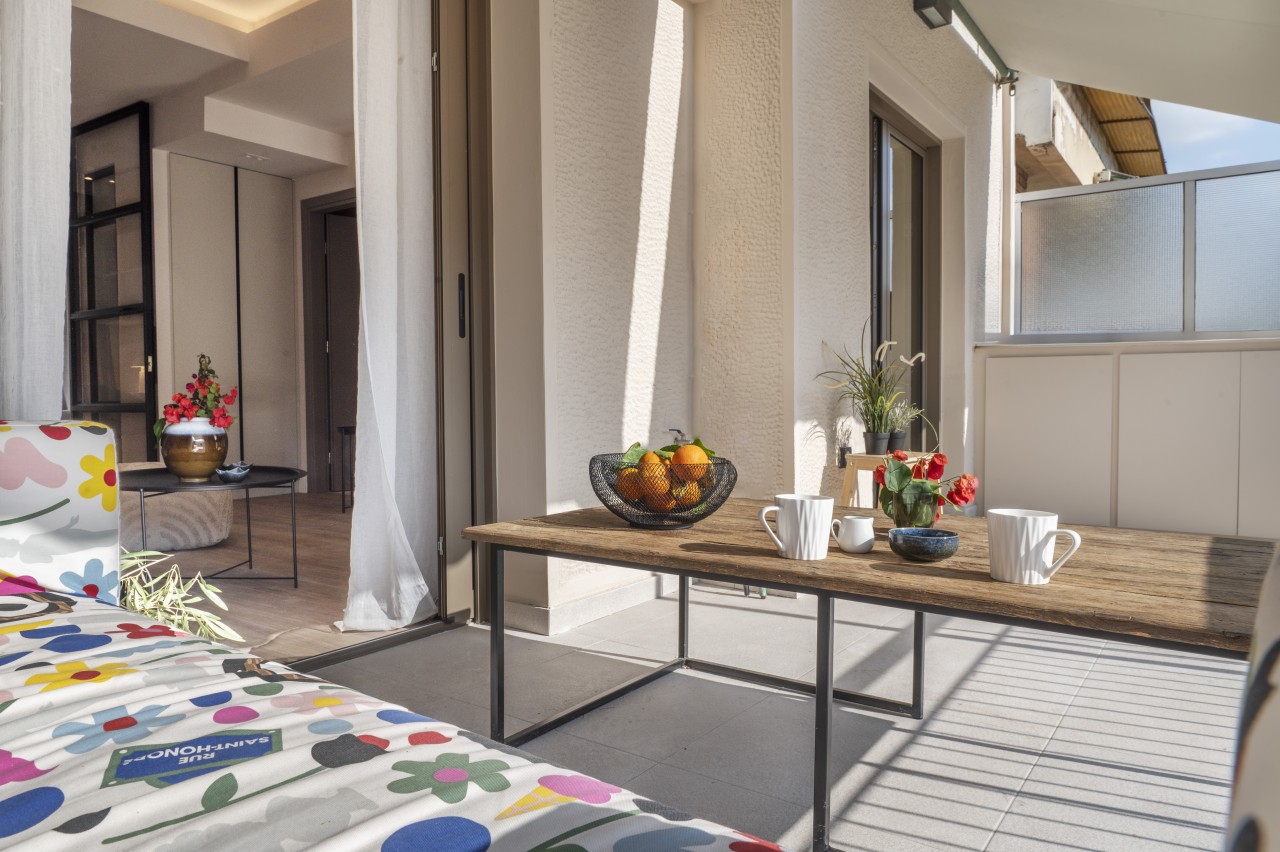 The main living area features a sleek, low-profile sofa in muted tones, a small dining space for 2 and an open plan kitchen.The kitchen is compact but fully equipped (dishwasher, stove, nespresso coffee machine) , featuring modern stainless steel appliances .The living area opens up into a spacious veranda overlooking Lykavitos hill