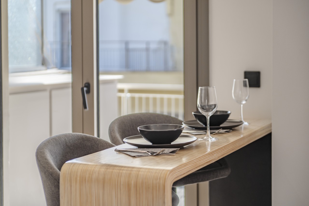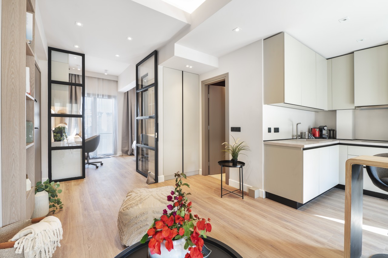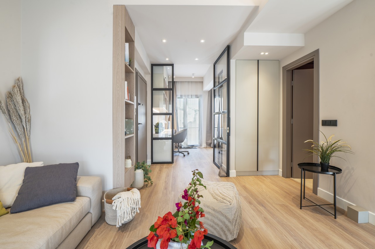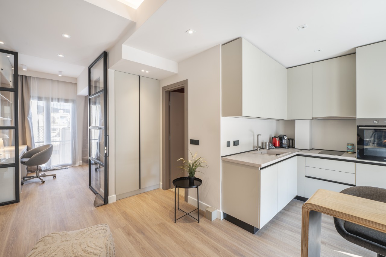 The main living area features a sleek, low-profile sofa in muted tones, a small dining space for 2 and an open plan kitchen.The kitchen is compact but fully equipped (dishwasher, stove, nespresso coffee machine) , featuring modern stainless steel appliances .The living area opens up into a spacious veranda overlooking Lykavitos hill