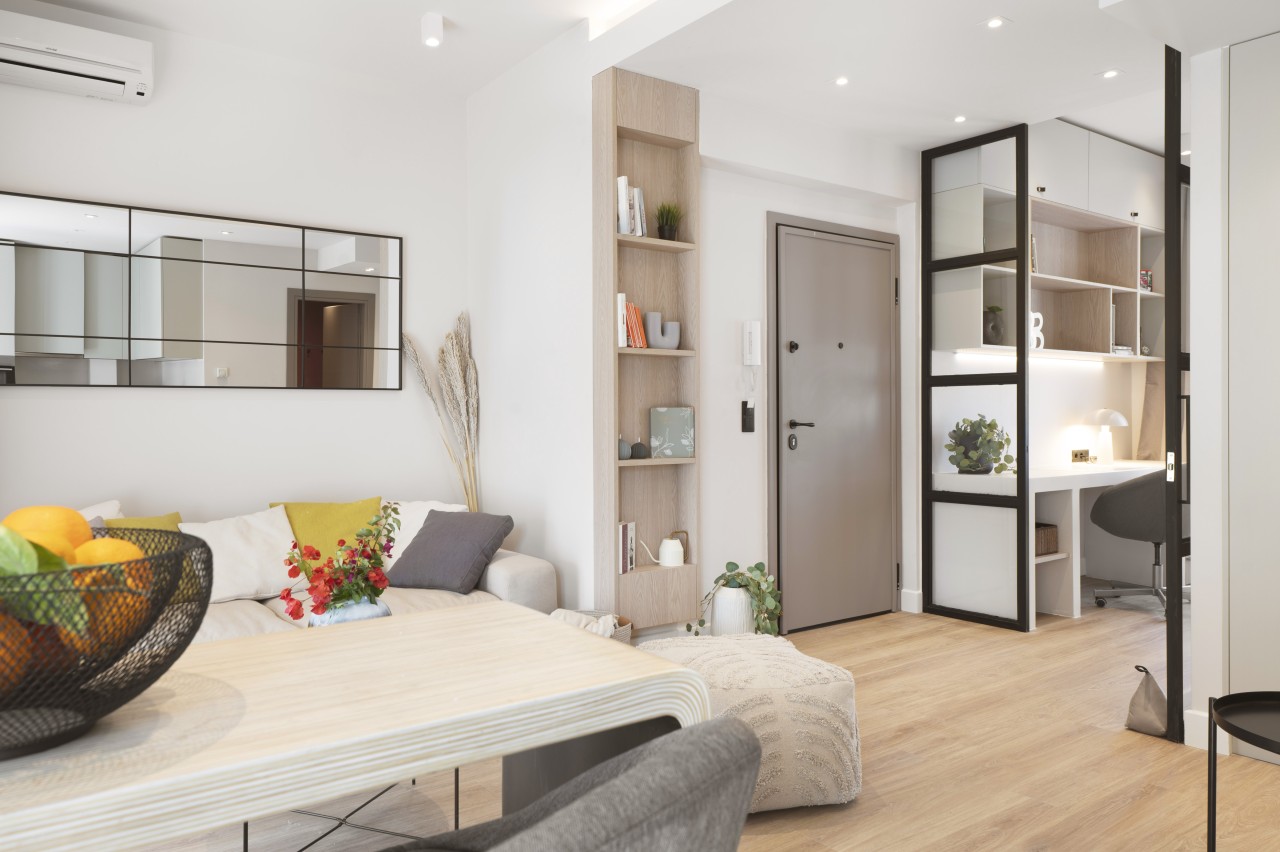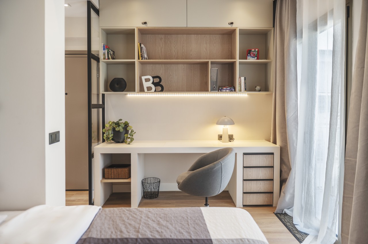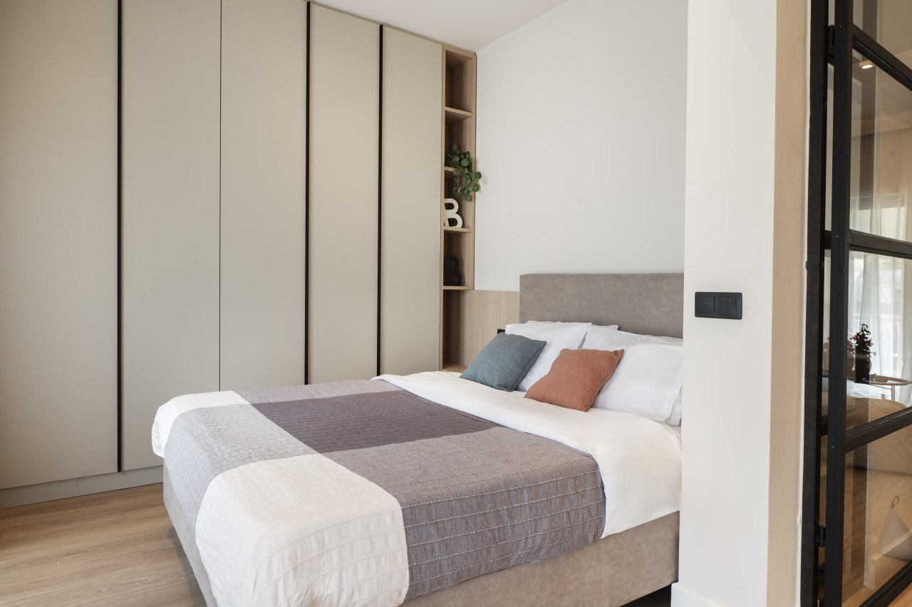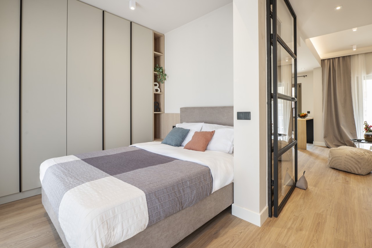 The sleeping area is thoughtfully integrated into the open floor plan, with a comfortable queen-size bed dressed in crisp white linens and soft throws. Ample storage space is tucked away to keep the space clutter-free.There’s a spacious workspace ideal for digital nomads or guests who need to catch up on some work. Sleeping & working space can be separated from then rest of living area via a metal glass door. An extra folding bed can be arranged on request in the living area to host an extra guest