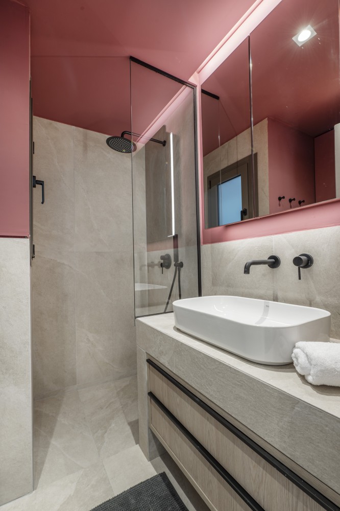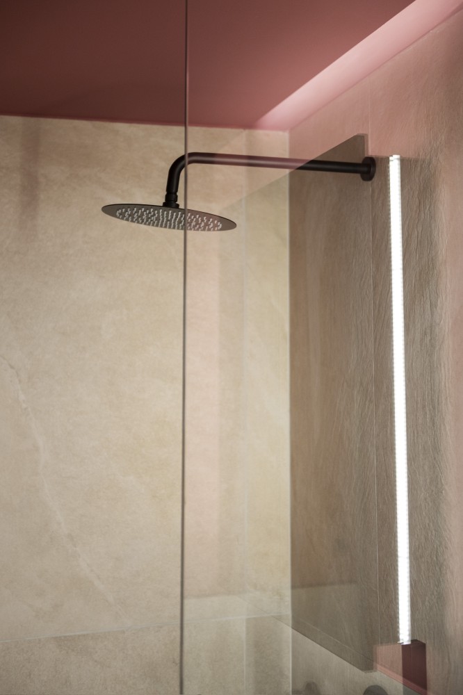 The bathroom, though compact, is modern and functional,a rain shower, with has plenty of space for toiletries