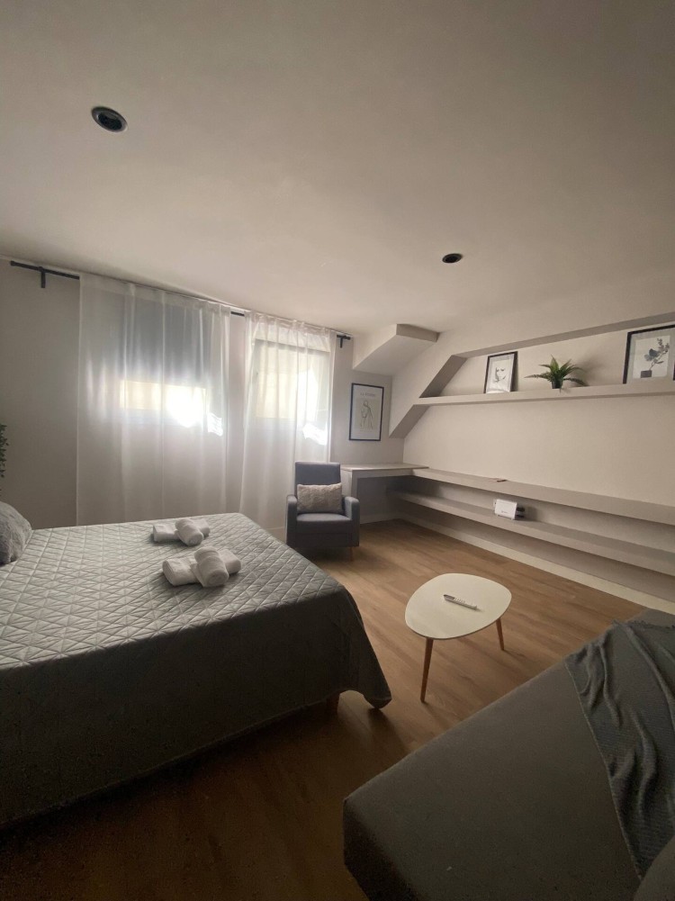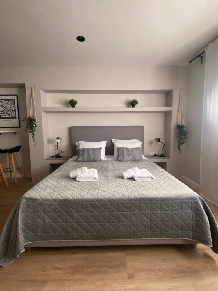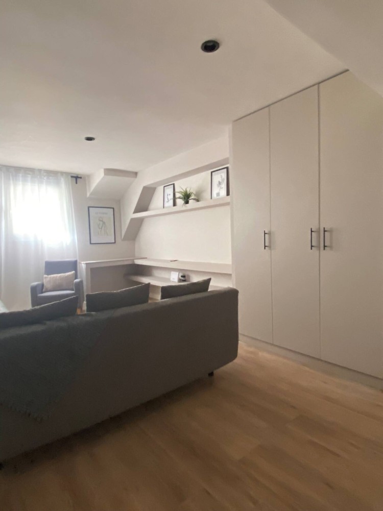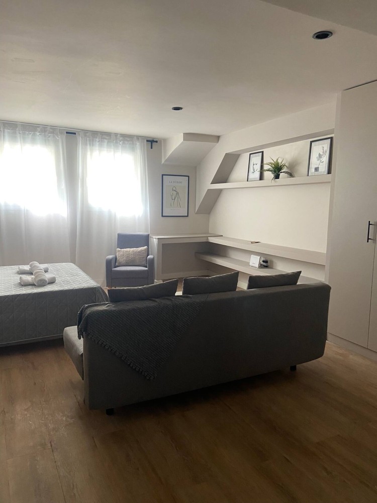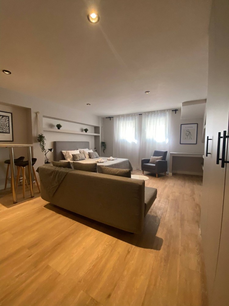 The studio is an open plan 35 sm open plan studio, with a queen sized bed, living space, office and a couch that could accommodate another 2 children, or another adult on request .