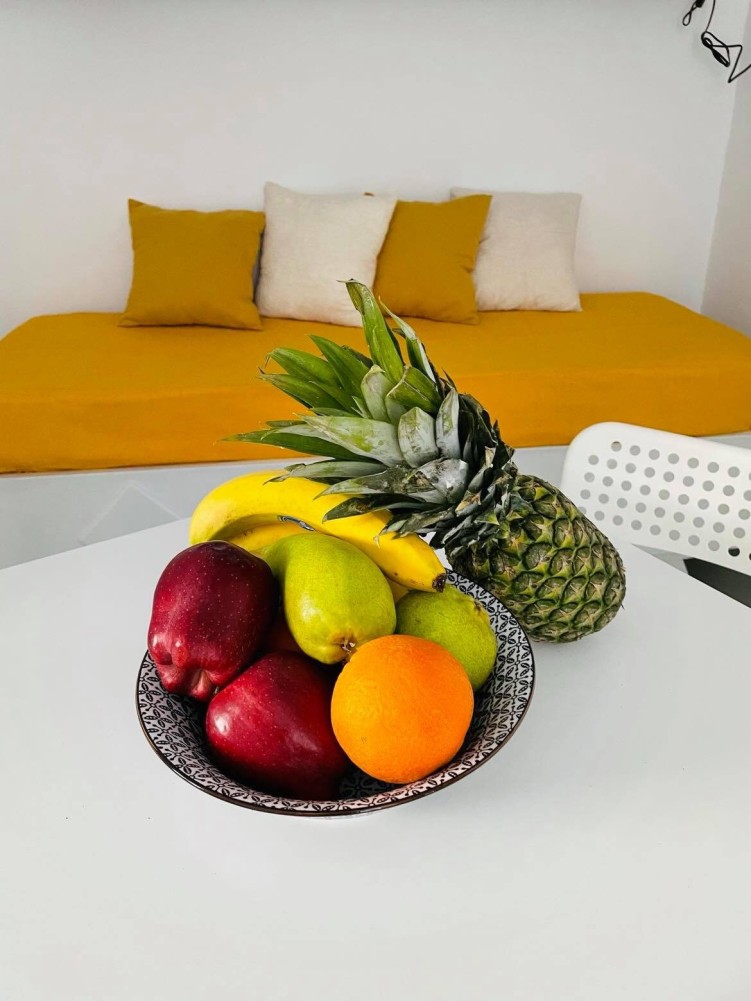The apartment is situated on the ground floor of the complex, entering through the common patio. The apartment consists of 2 bedrooms, each with a double bed, and an open plan kitchenette & living dining space. The sofa could accommodate an extra guest, preferably a child/teenager