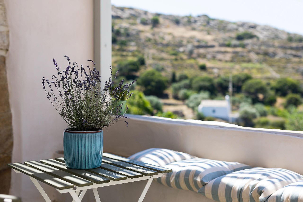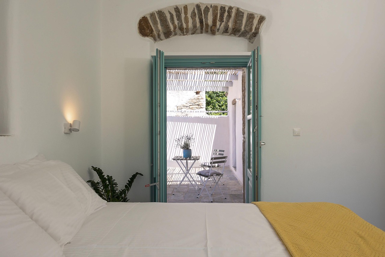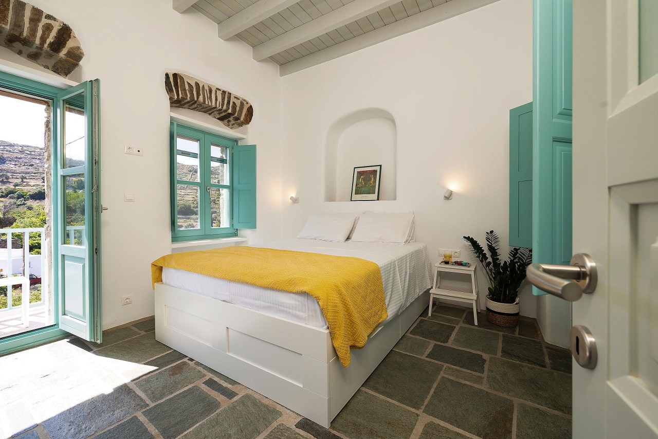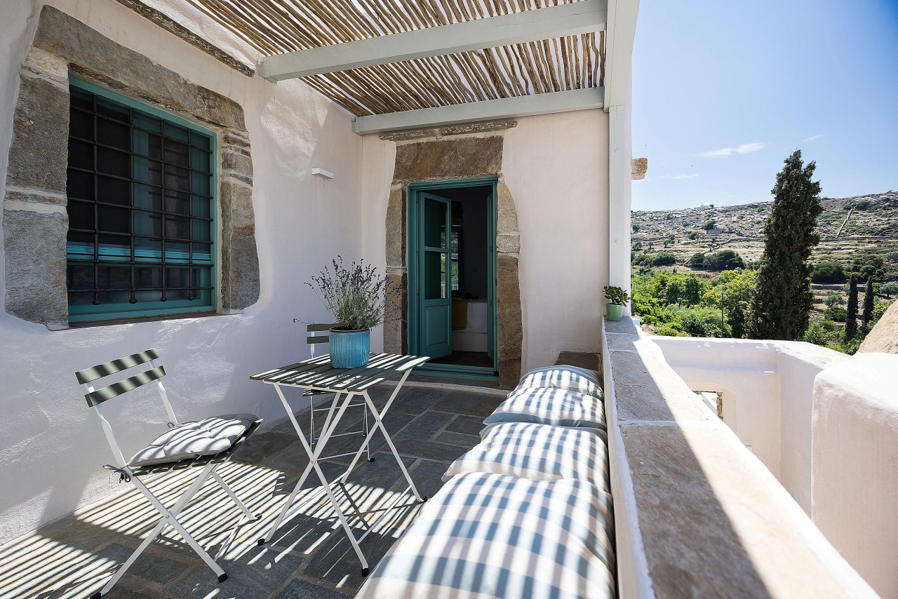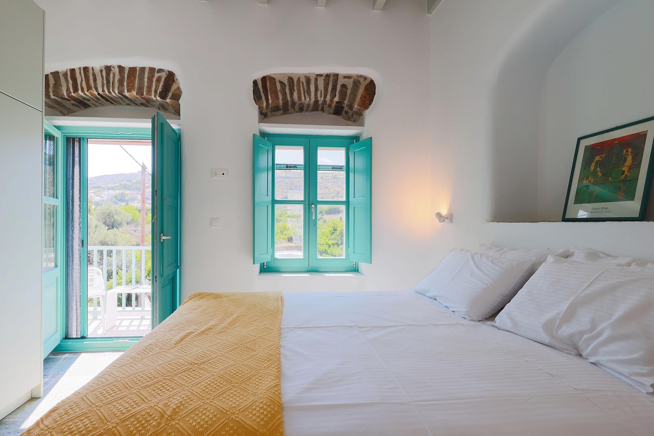 The bright bedroom (with 1 queen sized bed) is decorated with traditional furnishings and offers a balcony overlooking Naxo's landscapes.