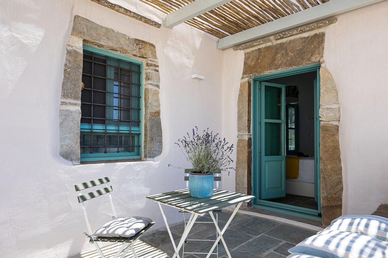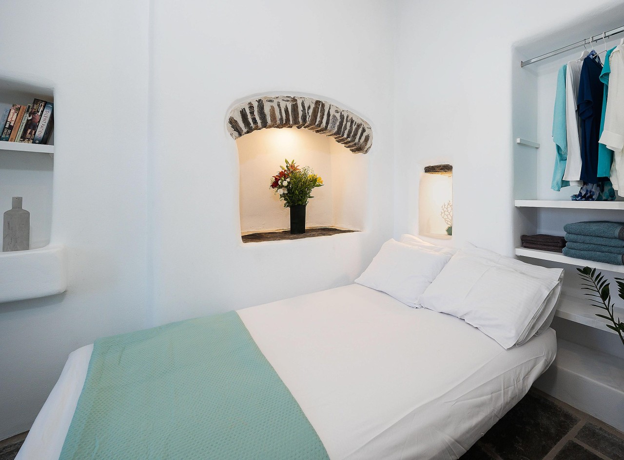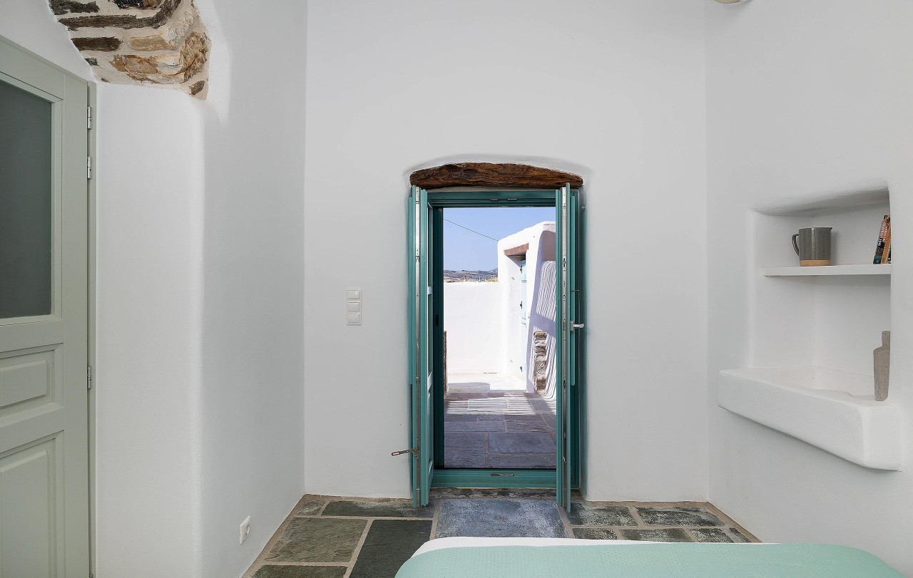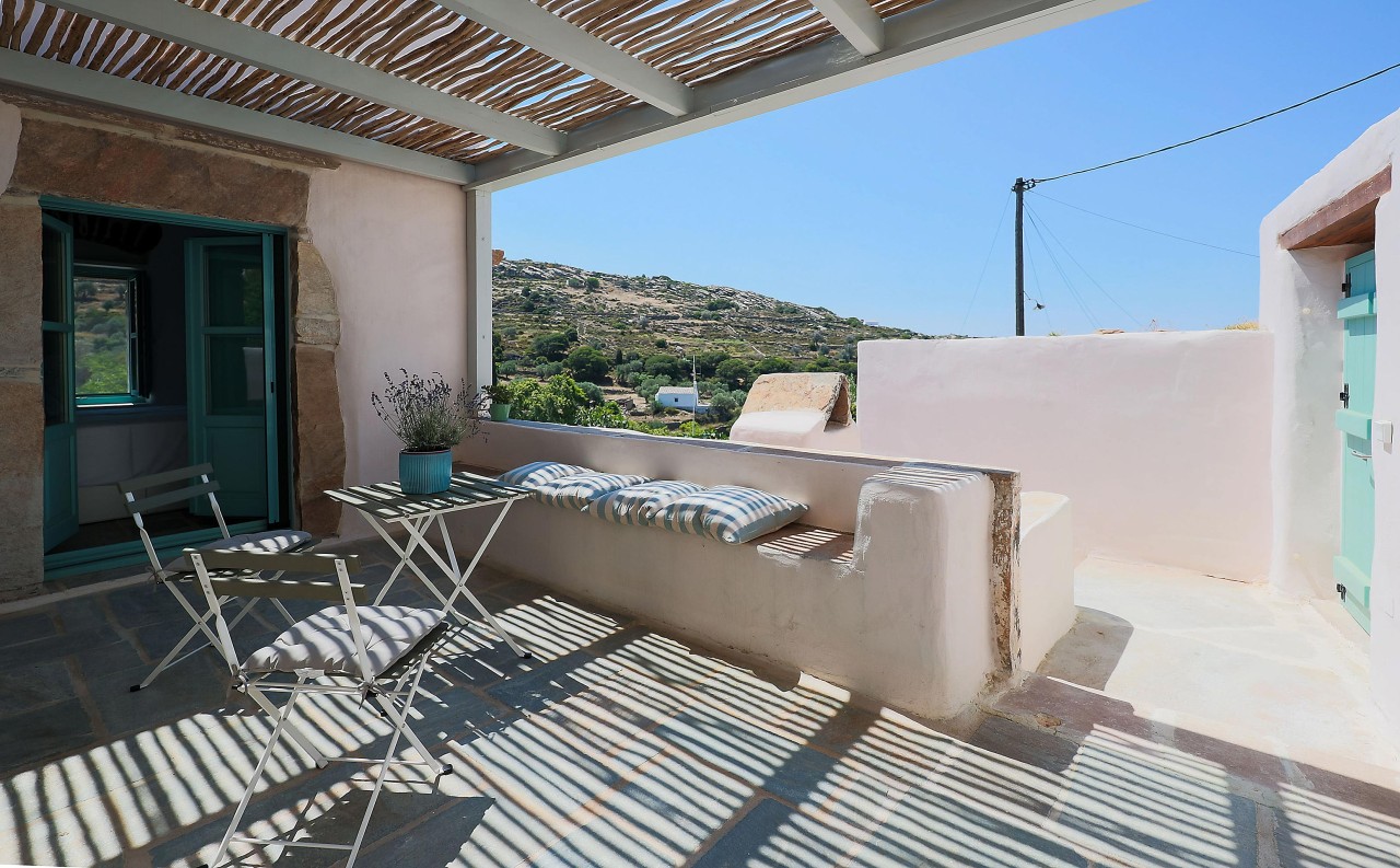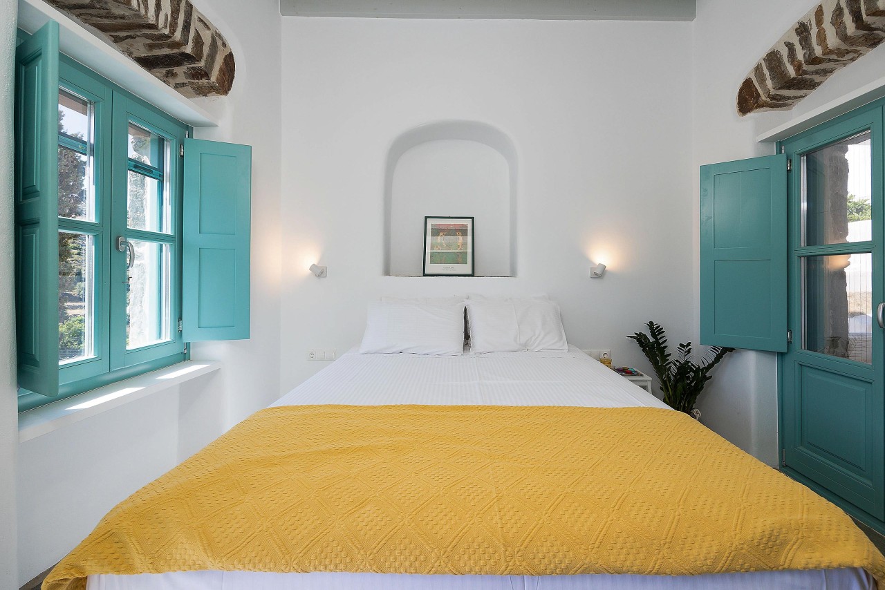 The bright bedroom (with 1 queen sized bed) is decorated with traditional furnishings and offers a balcony overlooking Naxo's landscapes.
