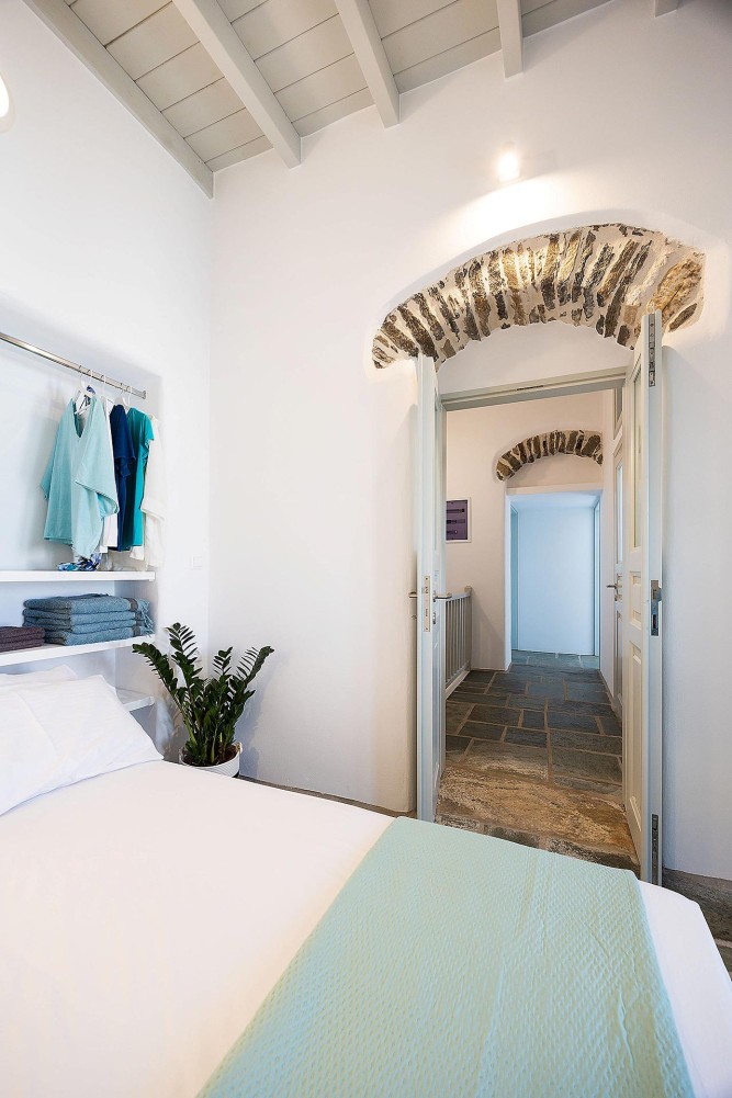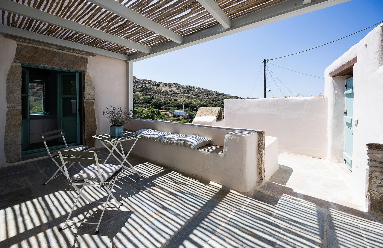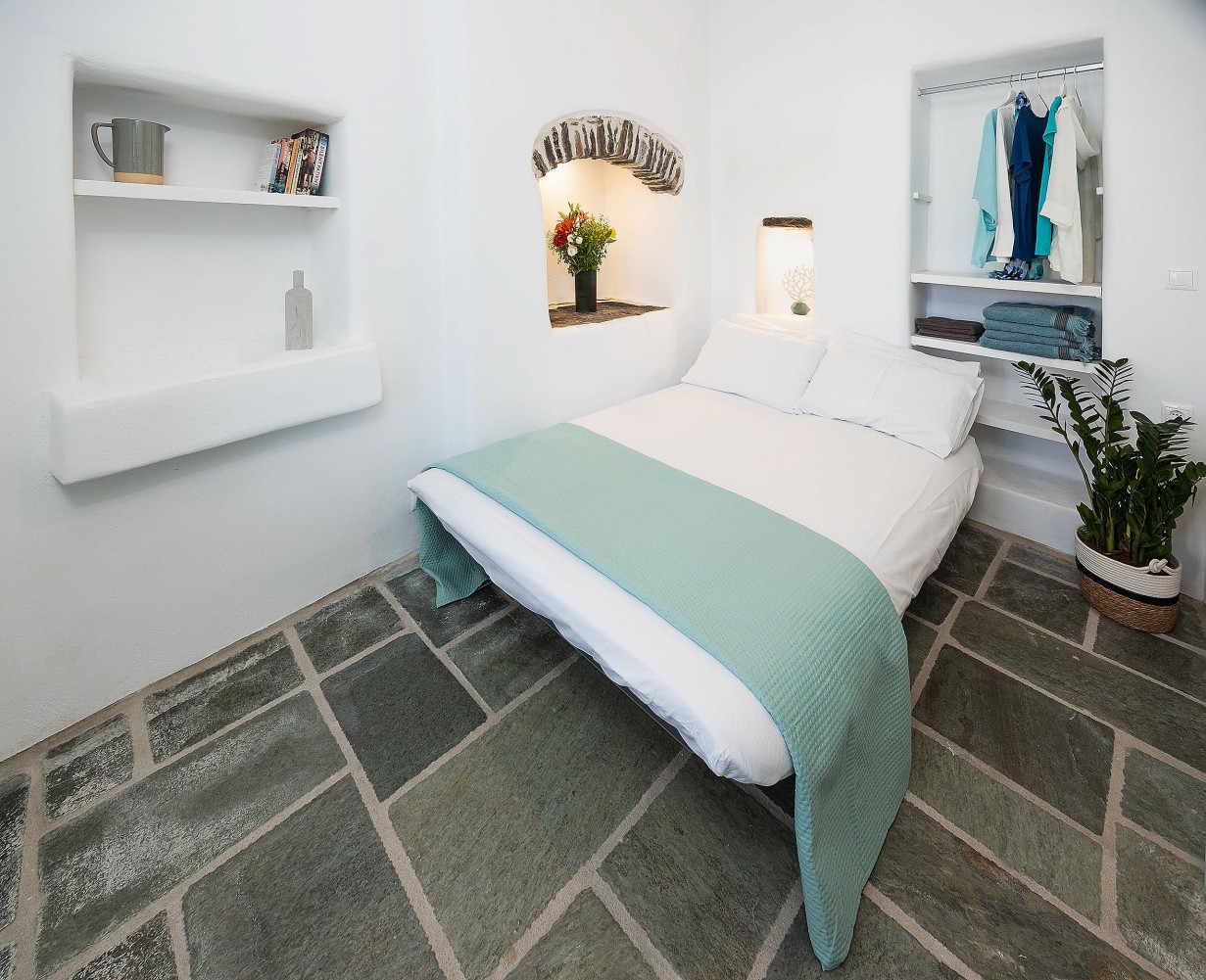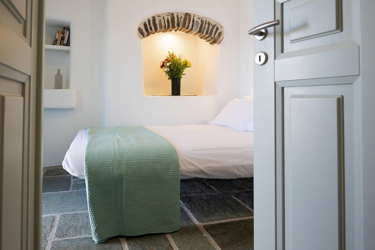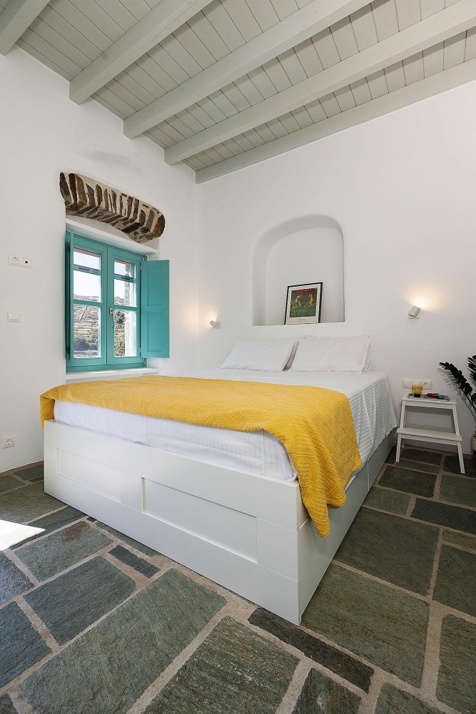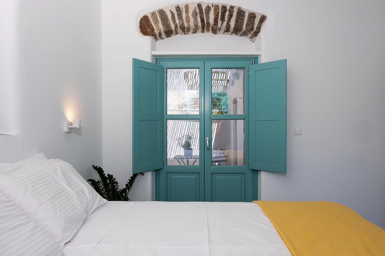 The bright bedroom (with 1 queen sized bed) is decorated with traditional furnishings and offers a balcony overlooking Naxo's landscapes.