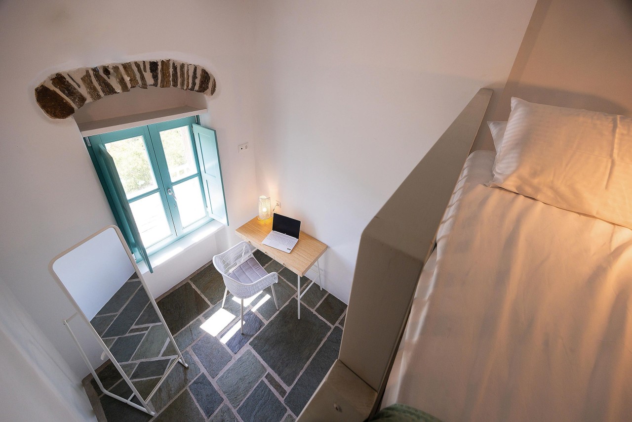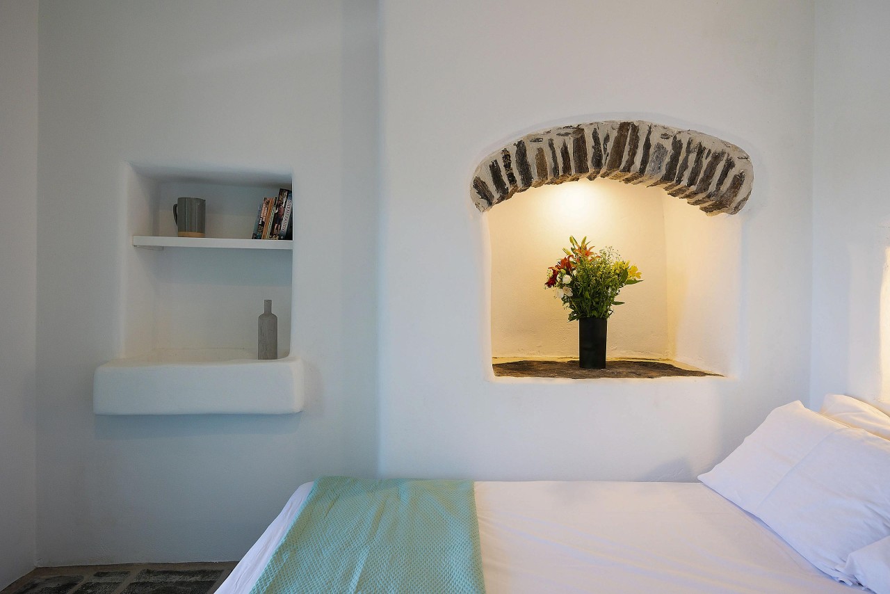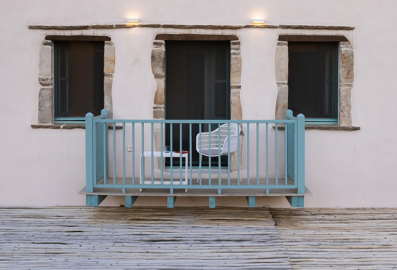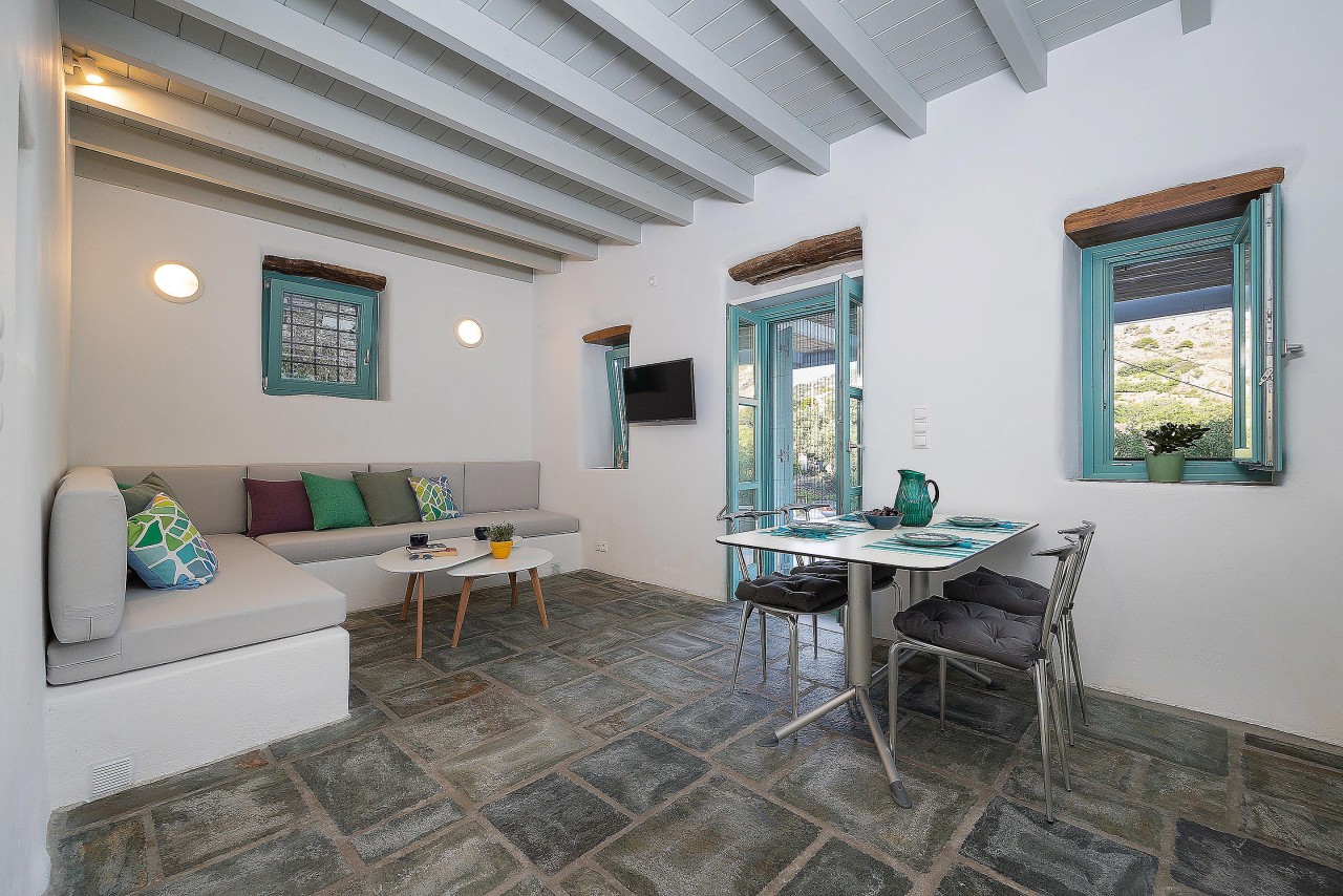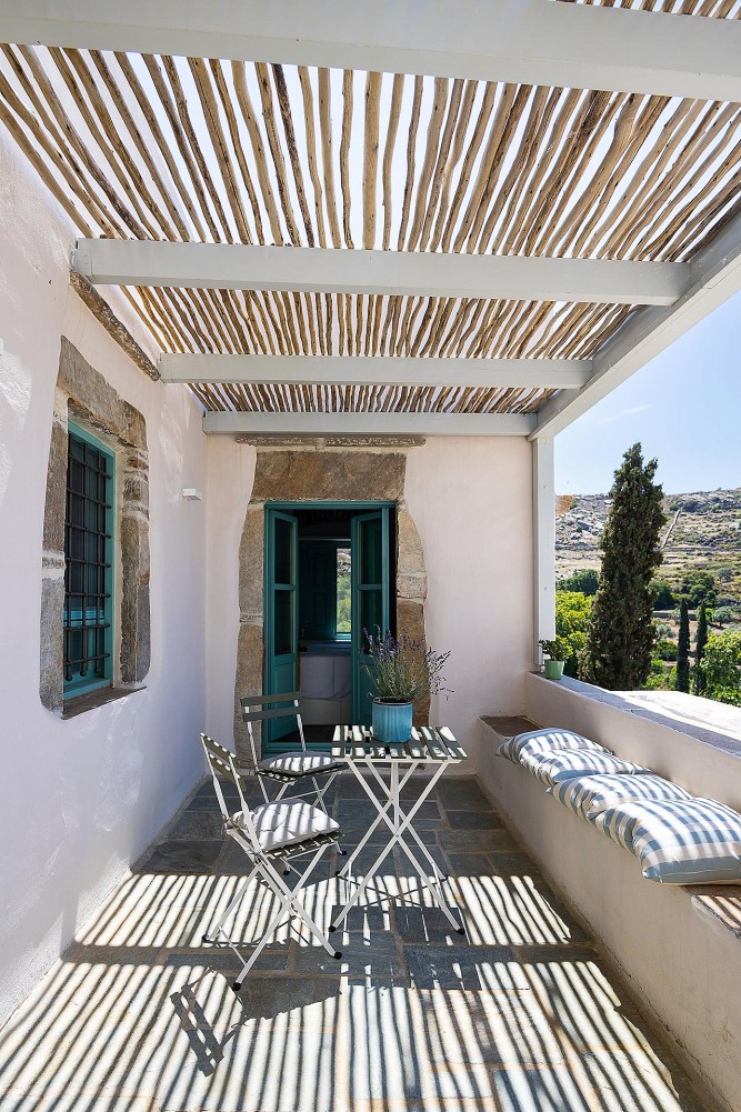The bright bedroom (with 1 queen sized bed) is decorated with traditional furnishings and offers a balcony overlooking Naxo's landscapes.