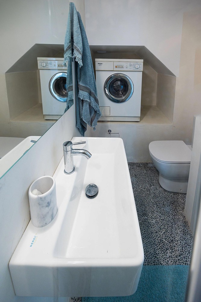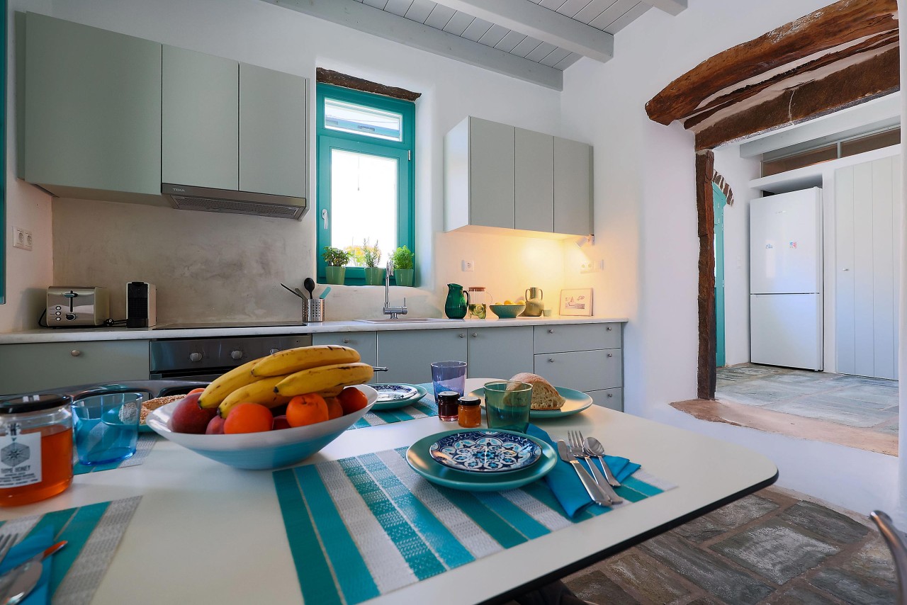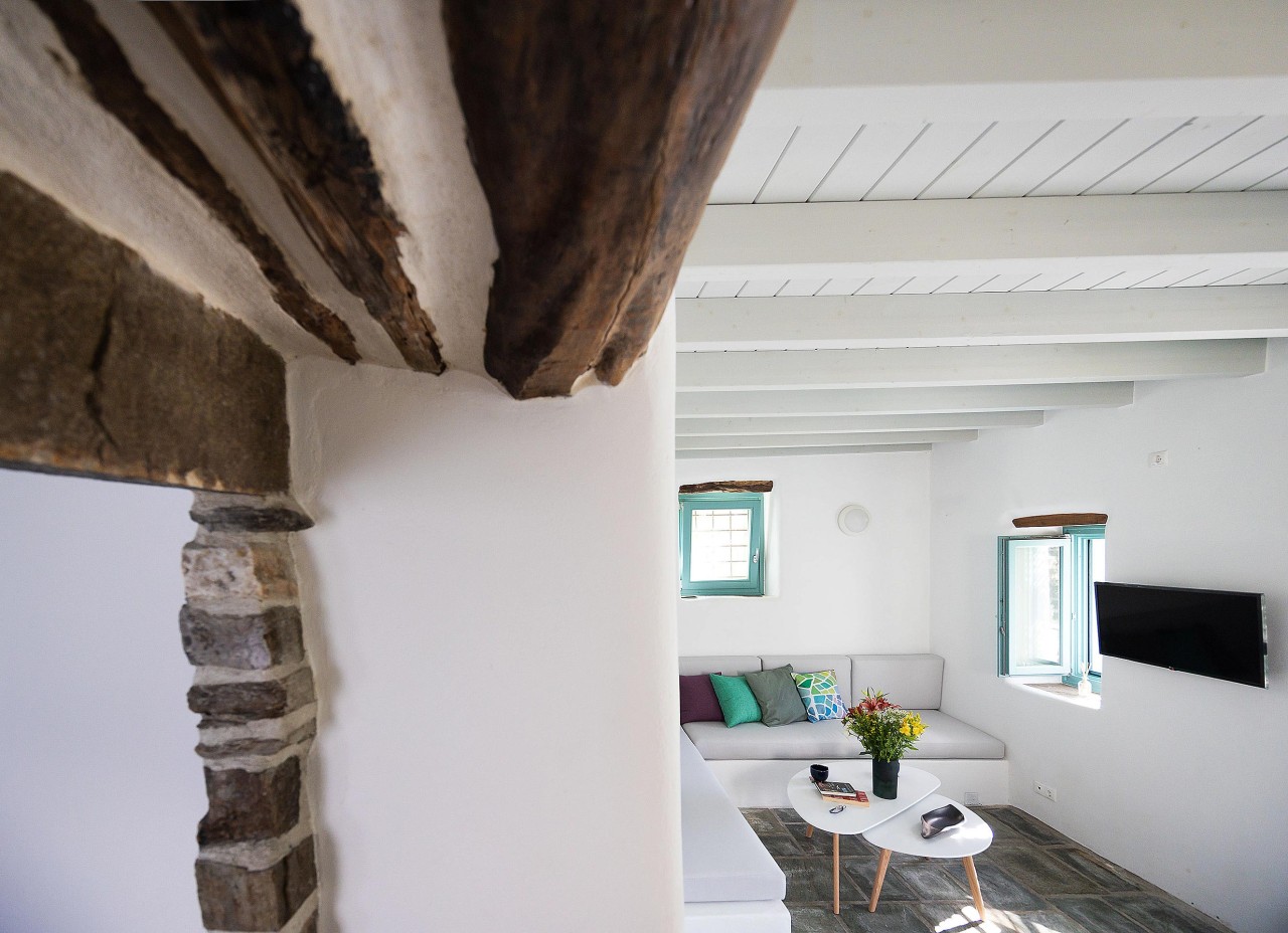 Exposed wooden beams, built in stone oven, thoughtfully selected antique furniture and local handicrafts offer a rustic yet elegant atmosphere. The built- in sofa can accommodate 2 extra guests in the living area